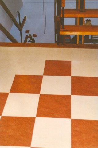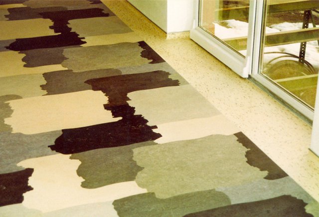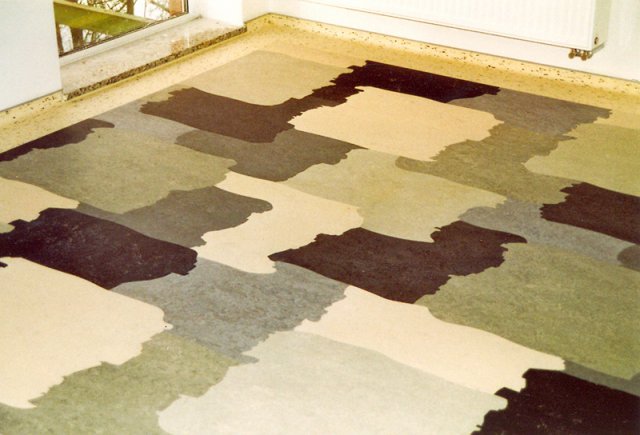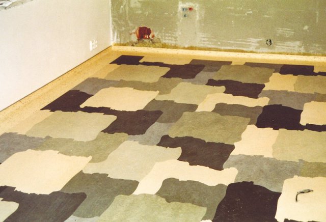 Puzzle vyrobené na zakázku kolekce Mendini, vytažené fabiony artoleum, ukončení hliníkovým profilem. (RD - obývací pokoj)
